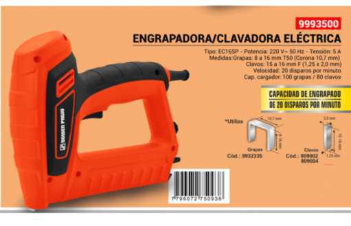 Tipo ec16sp 220v 50hz tensión 5a Medidas grapas 8 a16 mm t50 (corona10.7) Clavos de 15 a 16 mm (1.25x20mm) Velocidad 20 disparos x minuto Cargador de 100 grapas / 80 clavos