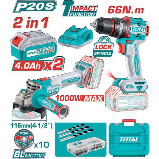1 amoladora angular inalámbrica brushless,<BR>diametro del disco 115mm, velocidad variables<BR>3000/6000/9000 rpm.<BR>1 taladro percutor inalámbrico compacto<BR>brushless, velocidad variable: 0-500/0-<BR>2000 rpm, impacto: 30.000 gpm, torque<BR>máximo: 66 Nm, mandril autoajustablemetálico<BR>13 mm, control de torque 22+1+1,caja de<BR>engranajes mecánica de 2 velocidades, luz<BR>detrabajo integrada<BR>CARACTERÍSTICAS TÉCNICAS<BR>10 discos abrasivos de corte para metal<BR>de115 mm, 47 accesorios, 1 batería de 4<BR>Ah, 1 batería de 2 Ah, 1 cargador, maletín