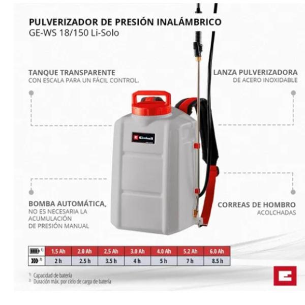 Cargador y Batería compatible con sistema Power Change Bomba automática. Depósito transparente con escala para control de nivel Boquilla de latón ajustable individualmente Lanza pulverizadora de acero inoxidable con botón de funcionamiento bloqueable Tapa de la batería: brinda protección contra la entrada de agua Correas de transporte acolchadas. Uso: pesticidas / fertilizantes / herbicidas Capacidad del tanque 15 litros Volumen del tanque 17 litros Temperatura máxima del líquido 40 ° C Presión máx. de pulverización 4,5 bares Tasa de flujo 102 l/h Longitud de la manguera de presión 1400 milímetros