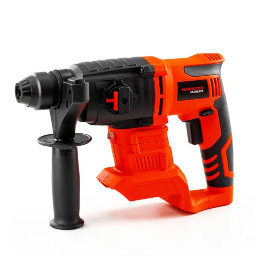 Rotomartillo a batería Brushless para perforación y cincelado en hormigón, ladrillo y mampostería. Compatible con baterías Ion-Litio 20 Vcc Hamilton de 2.0 o 4.0 Ah. Energía de impacto 2.2 J, velocidad sin carga 0-1150/min y hasta 0-5100 bpm. 4 funciones: taladro, taladro con percusión, cincelado y rotación libre del cincel para orientar el accesorio. Encastre SDS Plus para cambios ágiles. Incluye mango auxiliar con varilla limitadora de profundidad, 2 cinceles SDS Plus y 3 brocas SDS Plus. Cargador y bateria no incluido.