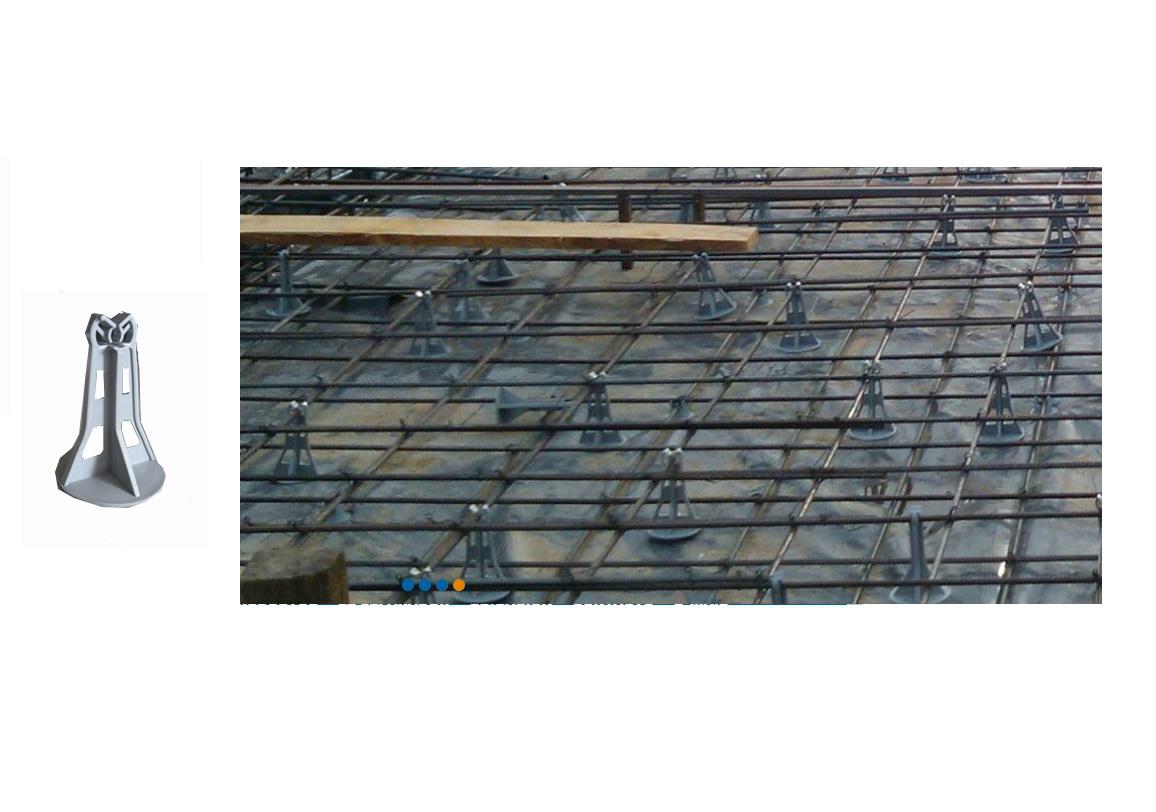 Especialmente diseñados para " Plateas de Fundación / Cimentación " Por el formato de su base, evita lastimar o Punzonar los Films de 200 micrones colocados en los fondos, ya que reparte el peso en su base circular. Evita la contaminación de las barras por transmisión / aislación de aire / humedad. Muy buena resistencia mecánica ( alto transito ) y perfecta estabilidad. Se colocan a modo de clip en posición vertical. Apto p/barras de 6-12mm Recubrimiento 100mm Consumos: En parrillas estándar ø 6 - 8 mm. 6 x Mt2 En parrillas pesadas ø 10 - 12mm. 8 x Mt2
