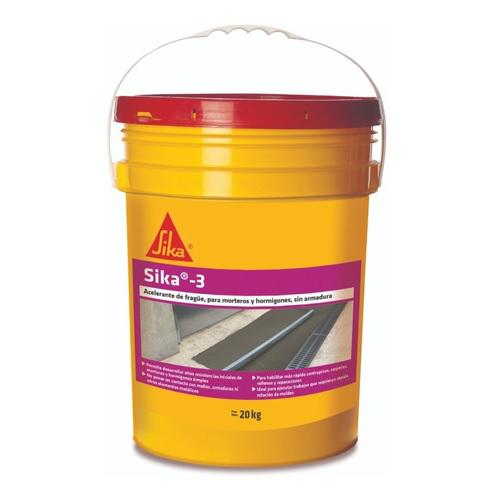Acelerante de fragüe para morteros y hormigones simples sin armaduras ni contacto con otros elementos metálicos. Contiene cloruros. CONSUMO: Depende de la dilución en agua a realizar. -Para morteros: para una bolsa de cemento de 50 kg, tomando una dilución de 1 parte Sika3 diluido en 2 partes de agua = 8,5 litros ó 9,9 kg. - Agua: 17,0 litros -Para hormigones: Para 1 m³, de hormigón de 300 kg. de cemento, si se utiliza Sika®- 3 diluido 1:5 en agua, se consumirán aproximadamente, 16 kg. de Sika3 Fraguado final: Dilucion 1:10 aprox 4:30 hs Almacenaje 24 meses