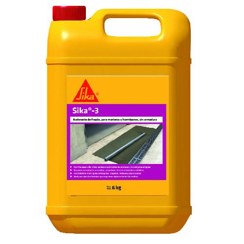 Acelerante de fragüe para morteros y hormigones simples sin armaduras ni contacto con otros elementos metálicos. Contiene cloruros. CONSUMO: Depende de la dilución en agua a realizar. -Para morteros: para una bolsa de cemento de 50 kg, tomando una dilución de 1 parte Sika3 diluido en 2 partes de agua = 8,5 litros ó 9,9 kg. - Agua: 17,0 litros -Para hormigones: Para 1 m³, de hormigón de 300 kg. de cemento, si se utiliza Sika®- 3 diluido 1:5 en agua, se consumirán aproximadamente, 16 kg. de Sika3 Fraguado final: Dilucion 1:10 aprox 4:30 hs Almacenaje 24 meses