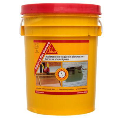 Acelerante de fragüe sin cloruros para morteros y hormigones armados No contiene cloruros. No corroe las armaduras ni los insertos metálicos. CONSUMO: Depende de la dilución en agua a realizar. Ejemplo: 8,5 kg. de Sika®-3 Sin Cloruro diluido 1:2 en agua cada 50 kg. de cemento. Fragüe Final en dilución 1:1 aprox 3:50 hs - Dilución 1:5 aprox 12 hs Almacenaje 24 meses