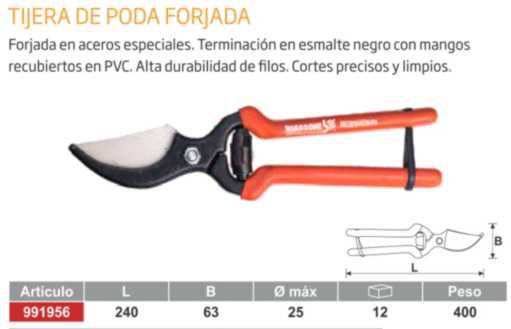 Forjada en acero especial.Terminacion esmalte negro con mangos recubiertos en PVC. Alta durabilidad de filos. Cortes precisos y limpios